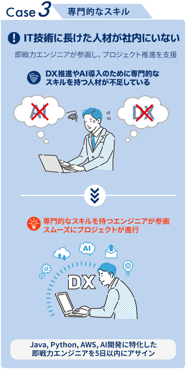 優秀なエンジニアが最短5日でプロジェクトに参画可能。新規事業をスピーディーに進め、リリースまでの期間を大幅に短縮